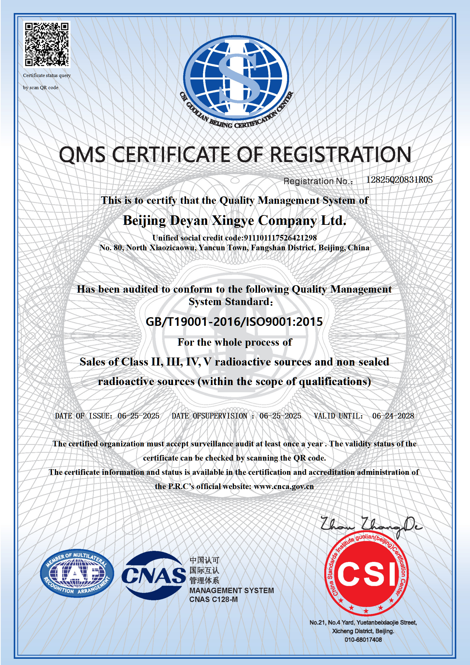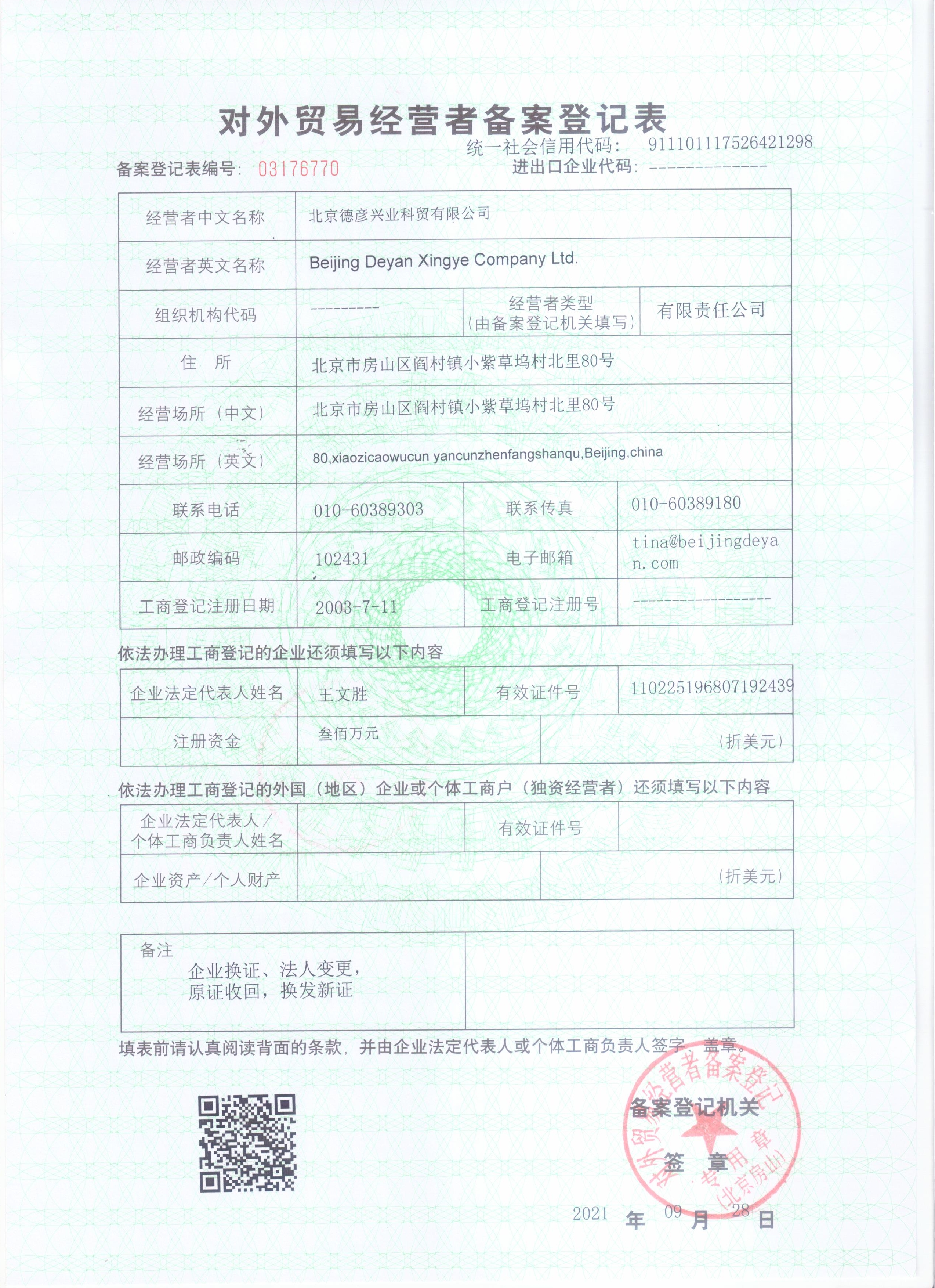 Beijing Deyan Xingye Company Ltd.(BDX)was established in July 2003. It is an import and export company specializing in radioisotope related trade and services. The headquarter is located in Fangshan District, Beijing, covering an area of 6,666 square meters, with an office area of 1,500 square meters. The company mainly engaged in one-stop services from radioisotope procurement, applying for approval, customs clearance, transportation for dangerous goods to the return of disused sources. It can also undertake independent business in any of these links.