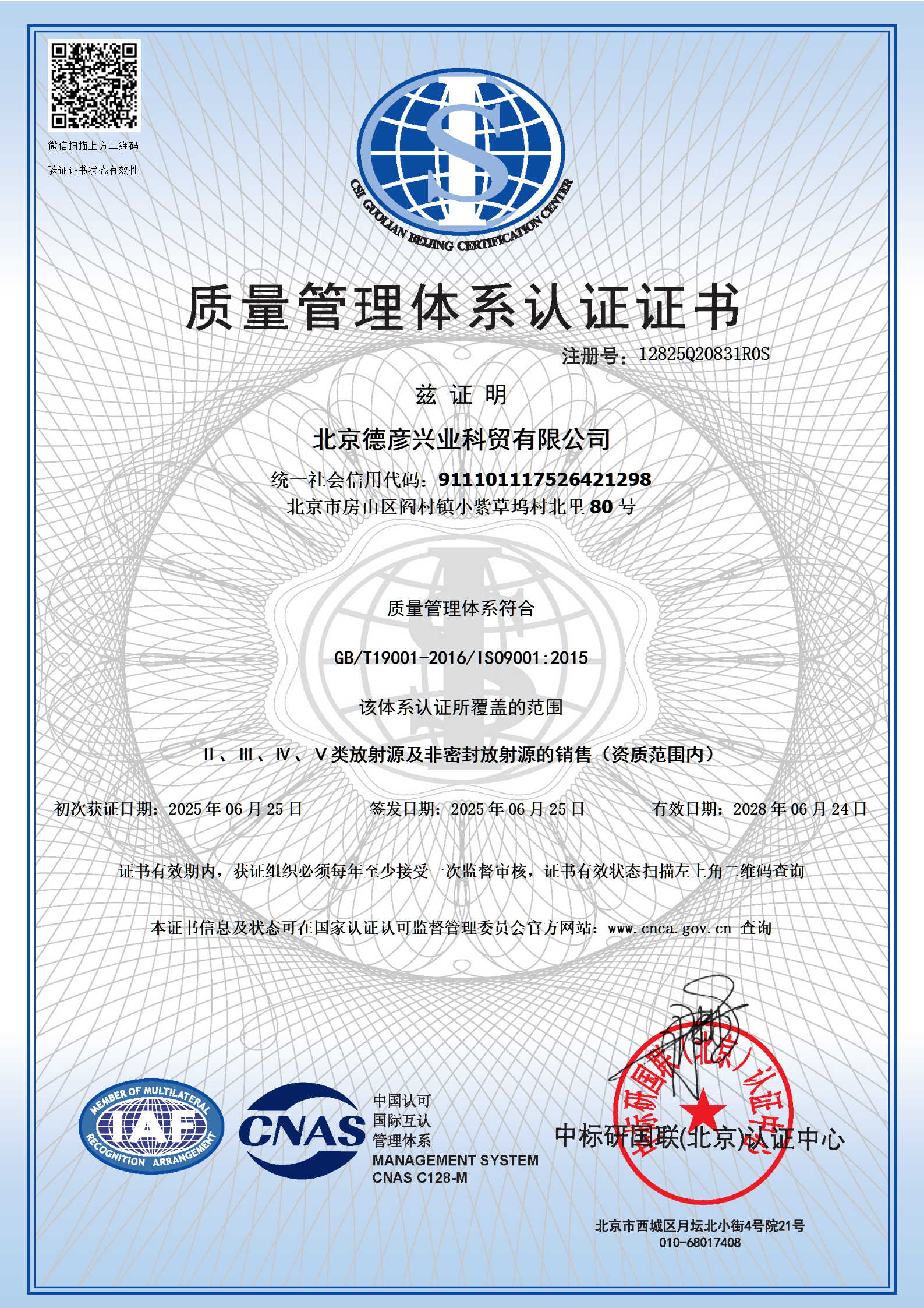 北京德彦拥有放射性产品经营资质及代理进出口权,目前已和国际上的数家放射源厂家和国内百余家用户单位建立了良好的合作关系。